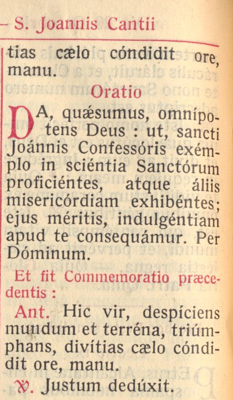 Da, quæsumus, omnípotens Deus : ut, sancti Joánnis Confessóris exémplo in sciéntia Sanctórum proficientes, atque áliis misericórdiam exhibéntes; ejus méritis, indulgéntiam apud te consequámur. Per Dóminum.