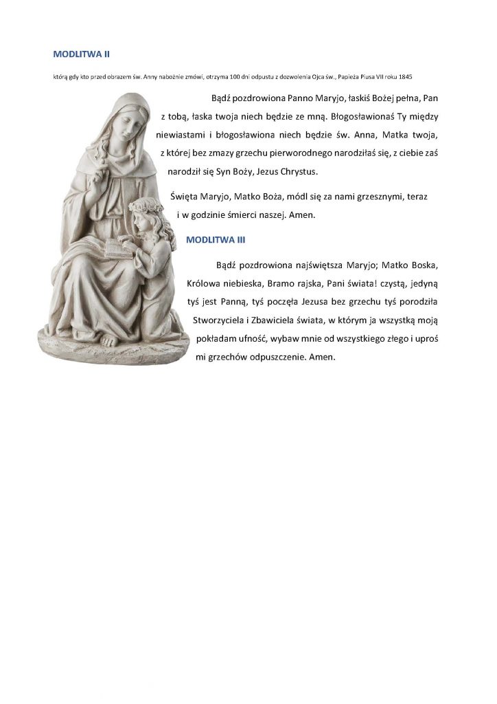 Błogosławiona Anno, matko N. M. P., racz przyjąć mnie w poczet sług Twoich i otoczyć skuteczną opieką. — Zachowaj mnie od wszystkich niebezpieczeństw życia. Bądź mi orędowniczką u Boga, kieruj moimi krokami, uproś mi błogosławieństwo w pracy i wytrwałości w trudach. Spraw, abym Twe cnoty naśladował( a) i życie pobożne i świętobliwe prowadził (a), a w chwili zgonu racz mi przyjść z pomocą. Przez Fana naszego Jezusa Chrystusa. Amen.