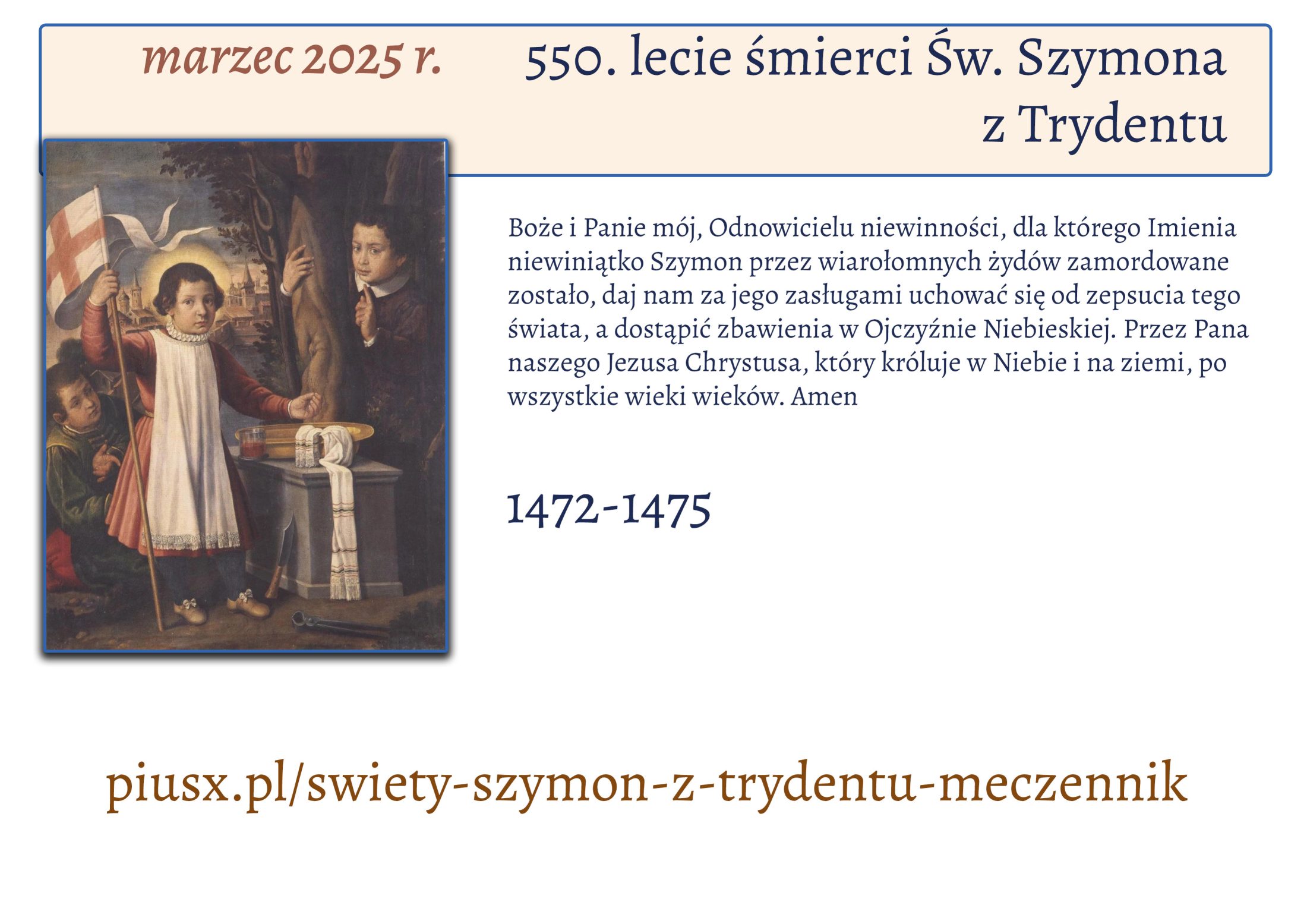 Boże i Panie mój, Odnowicielu niewinności, dla którego Imienia niewiniątko Szymon przez wiarołomnych żydów zamordowane zostało, daj nam za jego zasługami uchować się od zepsucia tego świata, a dostąpić zbawienia w Ojczyźnie Niebieskiej. Przez Pana naszego Jezusa Chrystusa, który króluje w Niebie i na ziemi, po wszystkie wieki wieków. Amen