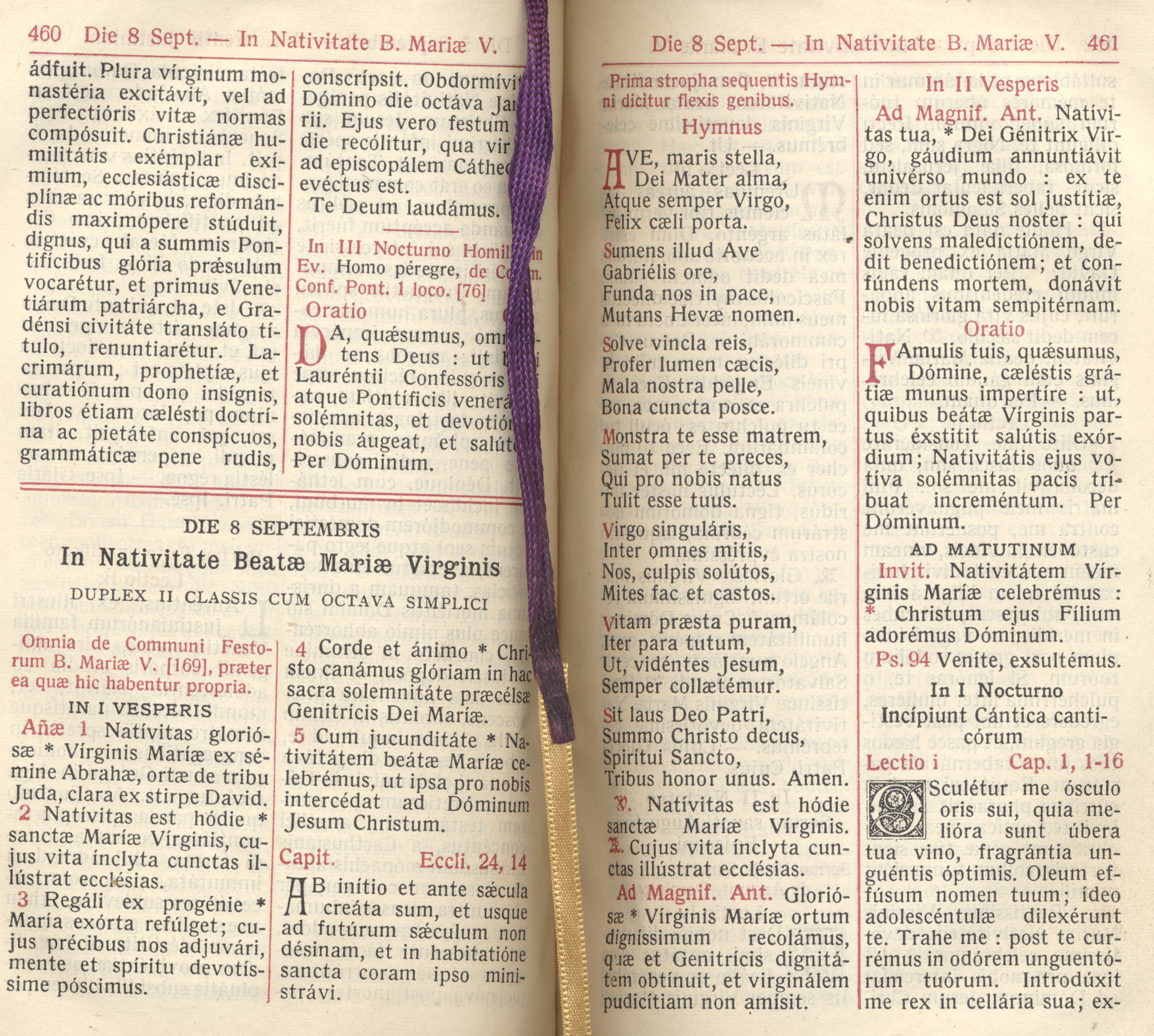 Kiedy w jakimś państwie królowa wchodzi do sali tronowej, by dawać uroczyste posłuchania, otwierają pochód heroldowie, zwiastujący jej przybycie, za nimi idą dostojnicy, niosący różne godła jej władzy, w końcu kroczą dworzanie i dworzanki, tworzący najbliższy jej orszak. Podobnie, nim Maryja przyszła na świat, zwiastowali Jej przyjście heroldowie Pańscy, to jest, pisarze święci i prorocy Starego Zakonu. Przerzućmy ich księgi, pod bezpośrednim natchnieniem Ducha Świętego spisane, a wyczytamy w nich proroctwa, ogłaszające, że Panna pocznie i porodzi Syna i nazwą imię Jego Emanuel, to jest, Bóg z nami (1), – że ta Panna, jako Matka Syna Bożego i Oblubienica Ducha Świętego, będzie czystą i bez zmazy (2), a piękną jak księżyc, wybraną jak słońce, ogromną jak wojska uszykowanie porządne (3), – że Ona stanie się Matką pięknej miłości i bogobojności i uznania i nadziei świętej (4), tak, że kto Ją znajdzie, znajdzie żywot i wyczerpnie zbawienie od Pana (5), – że Ona wreszcie jako Królowa zasiędzie na prawicy Syna (6).
