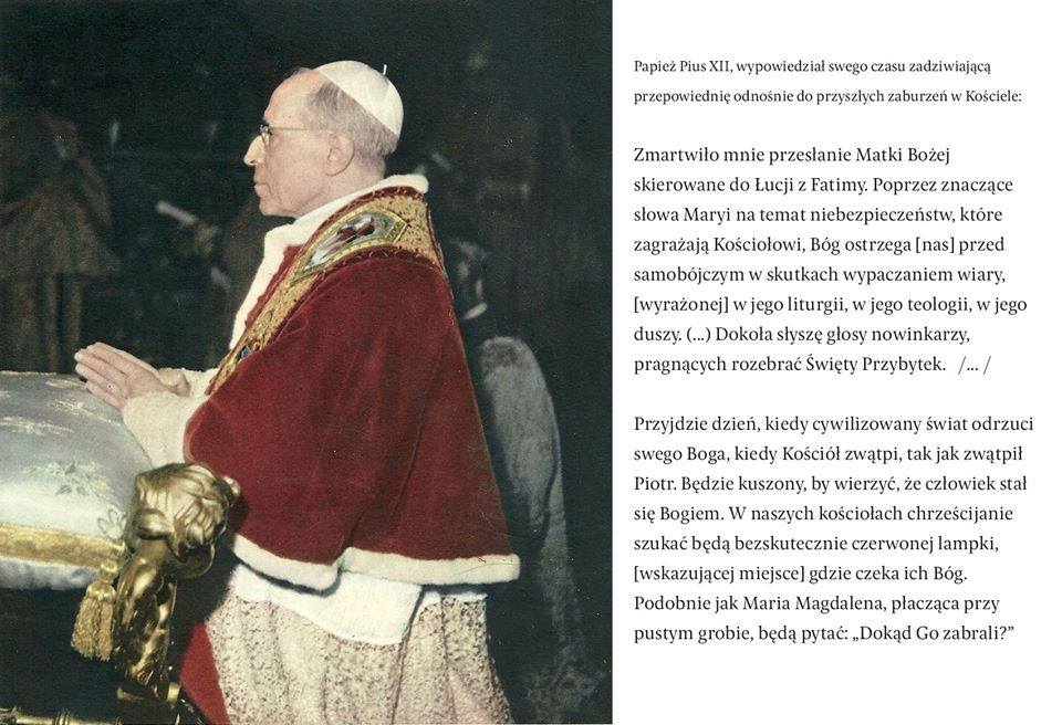Zmartwiło mnie przesłanie Matki Bożej skierowane do małej Łucji z Fatimy. Poprzez jednoznaczne słowa Maryi na temat niebezpieczeństw, które zagrażają Kościołowi, Bóg ostrzega nas przed samobójczym w skutkach wypaczaniem wiary, [poprzez dokonywane modyfikacje] w jego liturgii, w jego teologii, w jego duszy. Wokół mnie słyszę głosy uprawiających dywersję nowinkarzy, pragnących rozebrać Przybytek świątyni,odrzucić piękno i ozdoby, które są jego chlubą i sprawić, by poczuł wyrzuty sumienia rozważając swe minione lata. Cóż, moi drodzy, jestem przekonany, że jeśli Kościół Piotrowy odrzuci swoją przeszłość – tym samym wykopie dla siebie grób. Będę prowadził tę walkę z największym zaangażowaniem, zarówno wewnątrz jak i na zewnątrz Kościoła, nawet jeśliby siły Zła któregoś dnia miały przemóc moją osobę, moje poczynania czy też pozostawione przeze mnie pisma, tak jak już dziś próbują zdeformować historię Kościoła, a wszystkie dotychczasowe herezje humanizmu, które fałszowały Słowo Boże, wracają ponownie w świetle jupiterów. Przyjdzie dzień, kiedy cywilizowany świat odrzuci swego Boga, kiedy Kościół zwątpi, tak jak zwątpił Piotr. Będzie kuszony, by wierzyć, że człowiek stał się Bogiem i że jego Syn jest jedynie symbolem albo filozofią, jakich wiele. W naszych kościołach chrześcijanie szukać będą bezskutecznie czerwonej lampki, [wskazującej miejsce] gdzie czeka ich Bóg. Podobnie jak Maria Magdalena, płacząca przy pustym grobie, będą pytać: „Dokąd Go zabrali?”